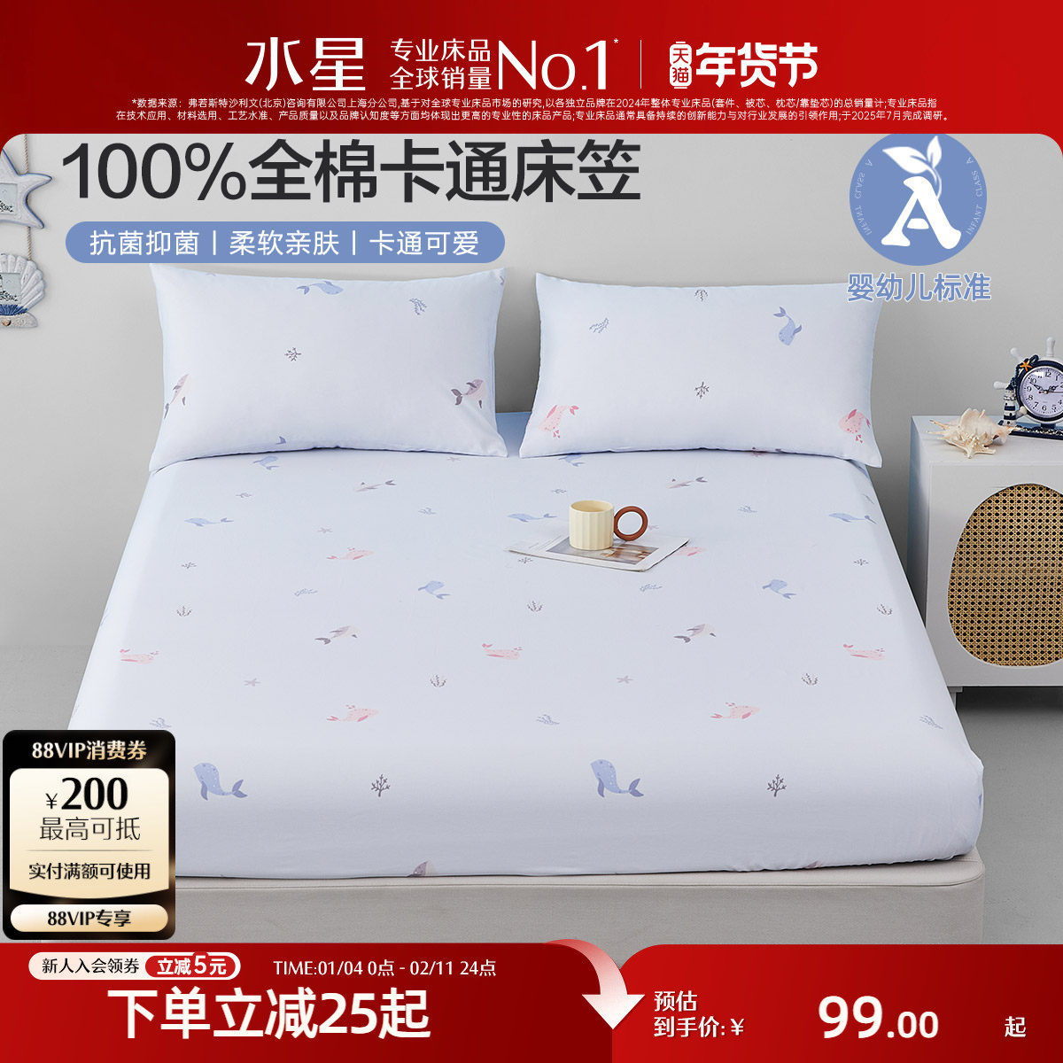 水星家纺床笠单件100纯棉床罩抗菌单双人宿舍床垫保护罩床上用品