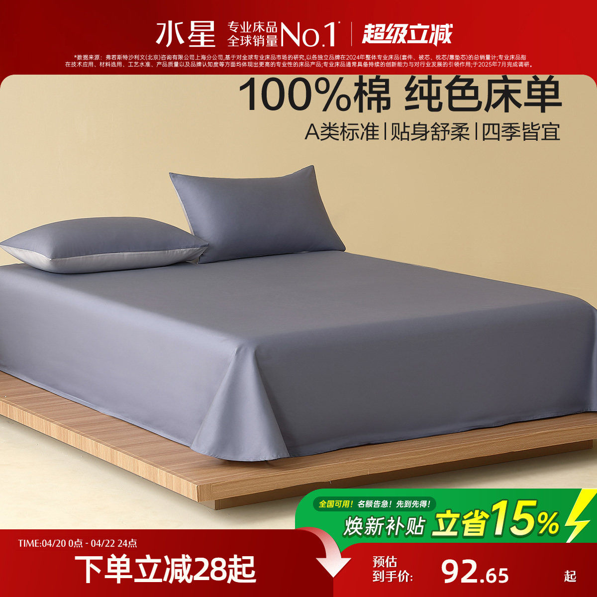 水星家纺A类全棉床笠单件100纯棉床垫保护套简约纯色家用床上用品