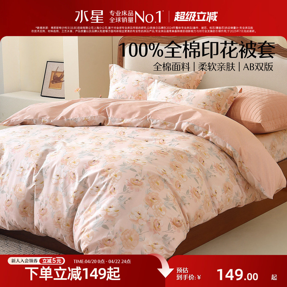 水星家纺全棉印花四件套100纯棉田园风被套床单四季床品26年新品