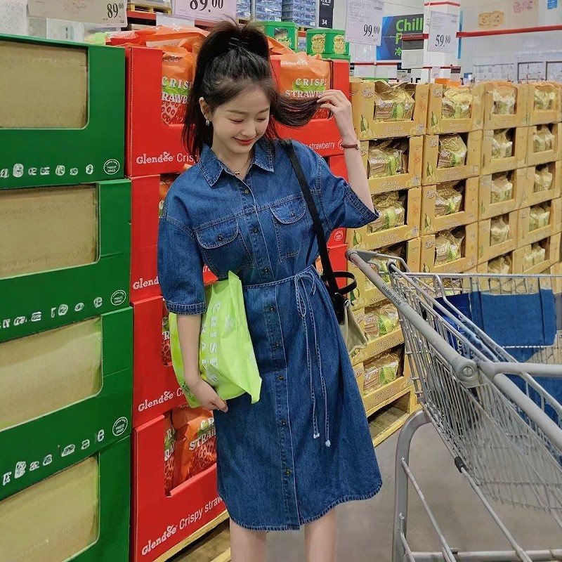 法式polo领收腰牛仔连衣裙女2024年夏新款韩版气质短袖中长鱼尾裙