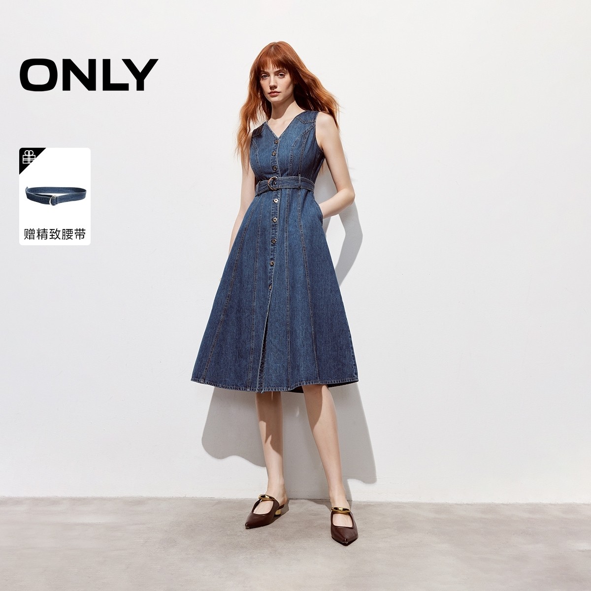 ONLY2026春季新款优雅简约V领无袖收腰牛仔连衣裙女|126142007
