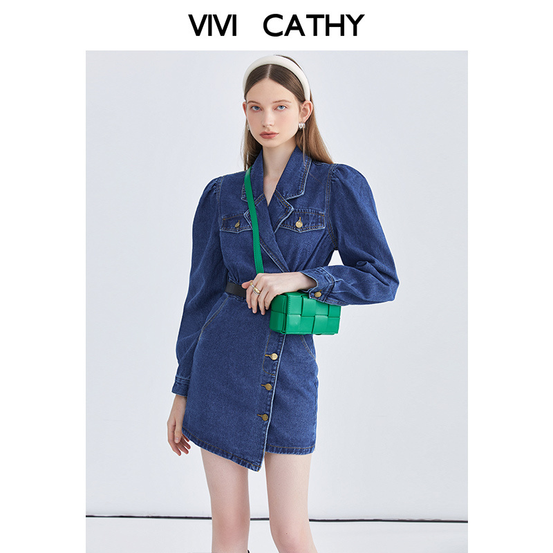 【特惠】VIVICATHY2025年新复古时尚设计感斜门襟收腰牛仔连衣裙
