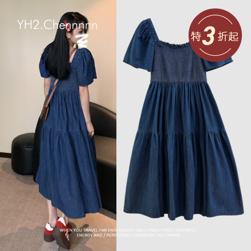 韩国东大门方领泡泡袖收腰牛仔连衣裙女短袖夏季中长款显瘦a字裙