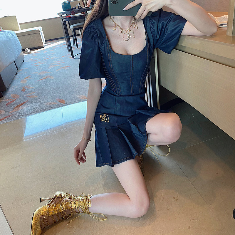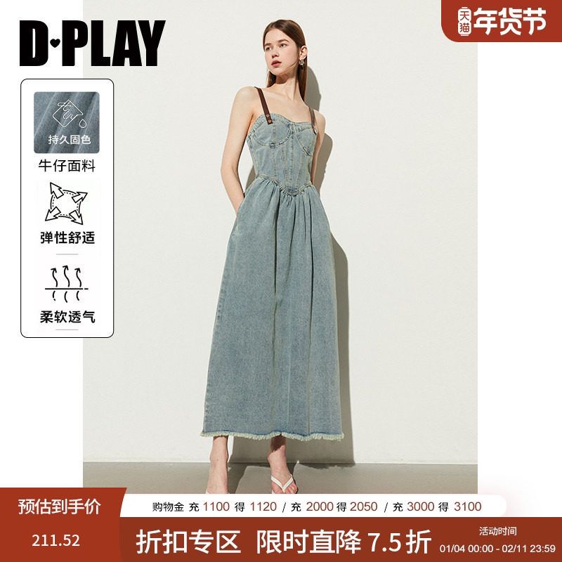 DPLAY【惠品】年夏季复古抹胸设计吊带裙气质收腰牛仔连衣裙