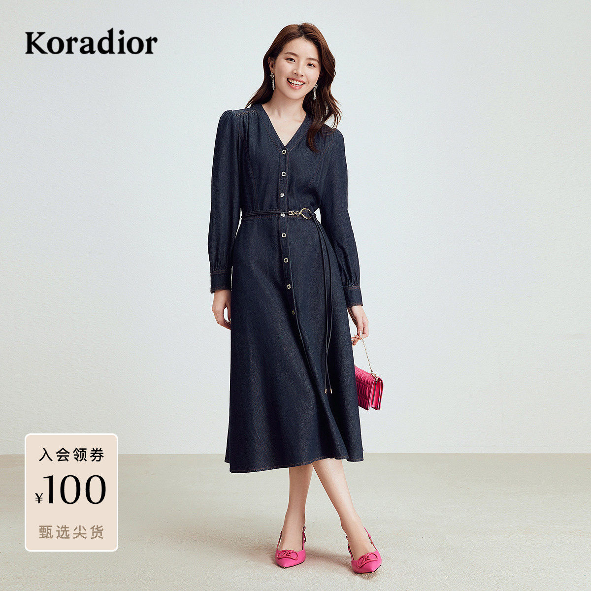 【商场同款】珂莱蒂尔秋季气质纯棉经典减龄V领收腰牛仔连衣裙女