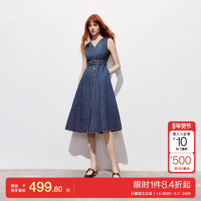绫致ONLY2026春季新款优雅简约V领无袖收腰牛仔连衣裙女