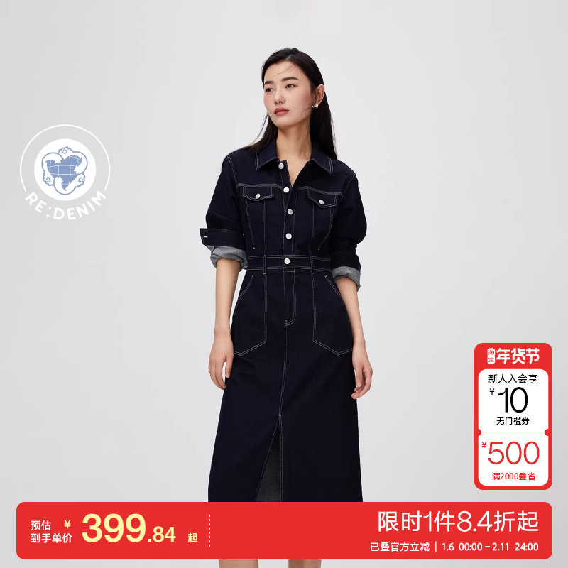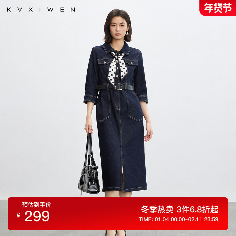 珂莱蒂尔2026年春季新款衬衫裙子女中长款通勤收腰牛仔连衣裙