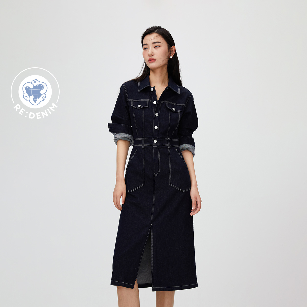 太平鸟 2025年秋季收腰牛仔连衣裙复古通勤裙子女古着牛仔裙奥莱