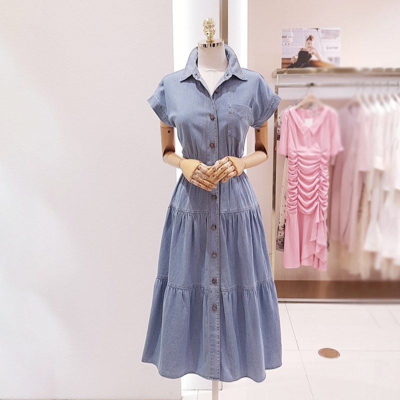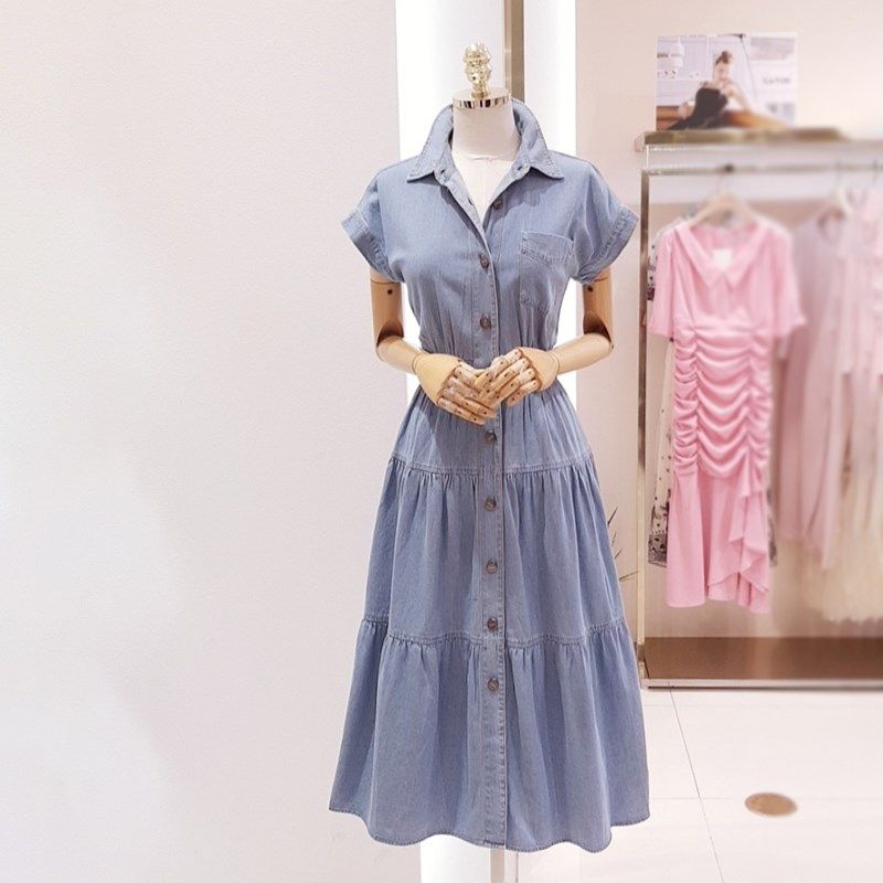 时尚翻领单排扣收腰牛仔连衣裙2024年夏季新款气质高腰显瘦长裙