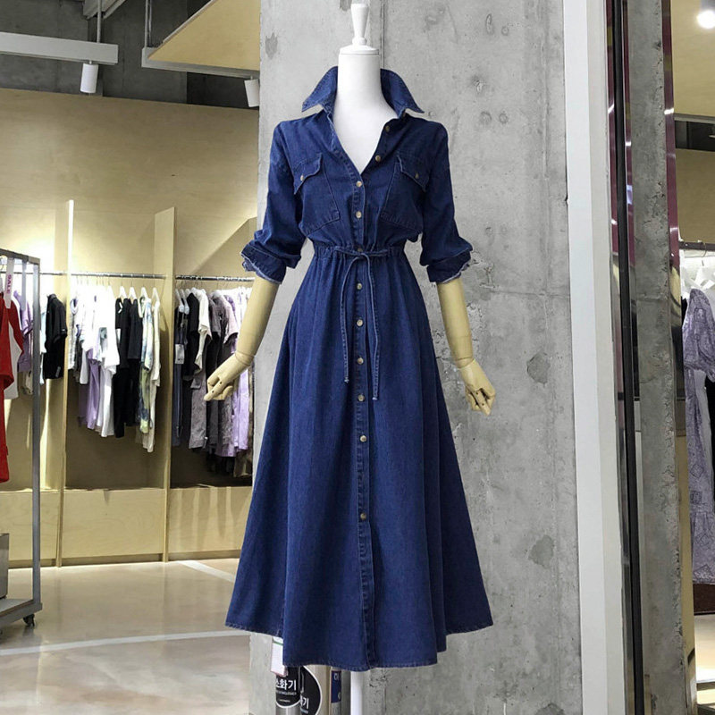紫涵翻领收腰牛仔连衣裙女春秋季新款休闲显瘦单排扣A字中长裙子