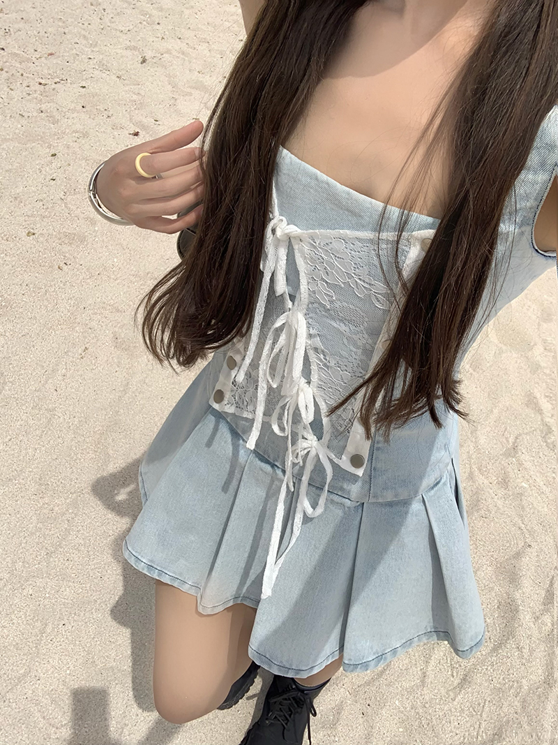 soolrok 松未韵一 牛仔弗洛里 可拆卸蕾丝抽褶片收腰牛仔连衣裙女