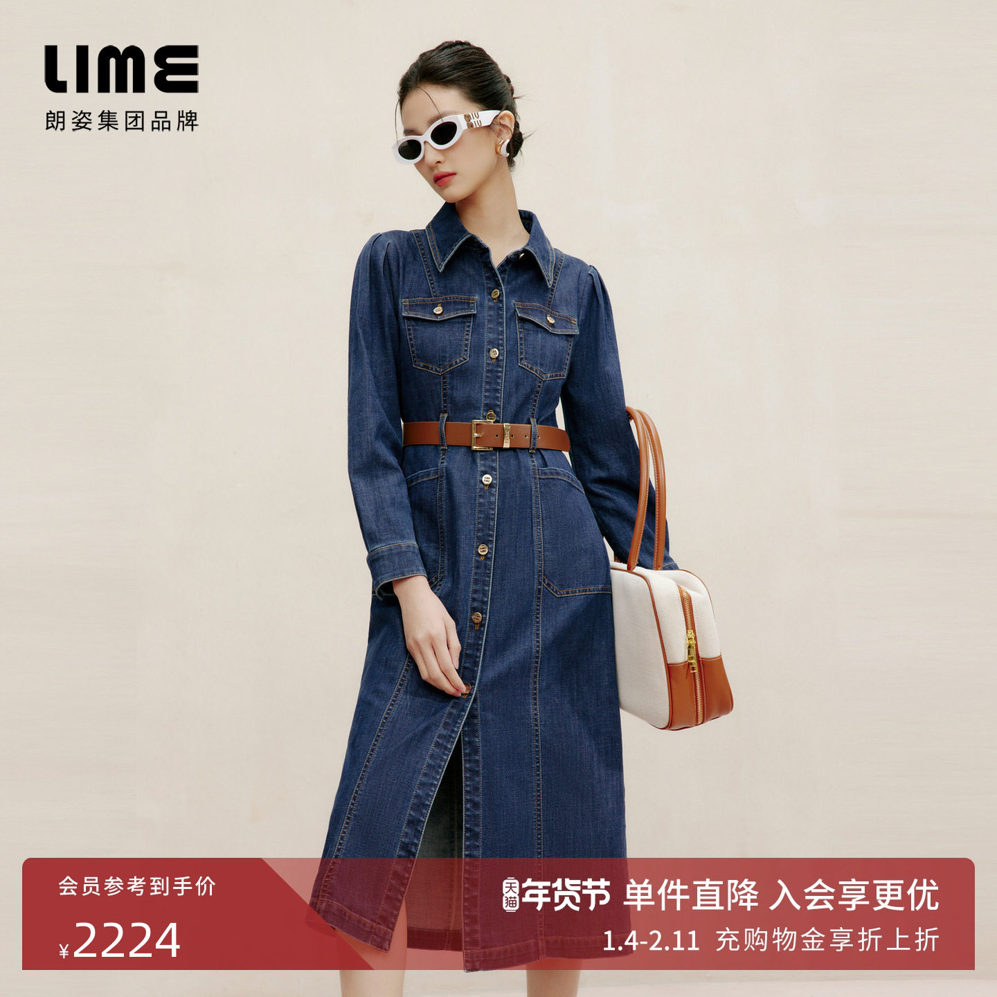 朗姿集团LIME莱茵翻领收腰牛仔连衣裙25春扣腰带高腰复古衬衫裙