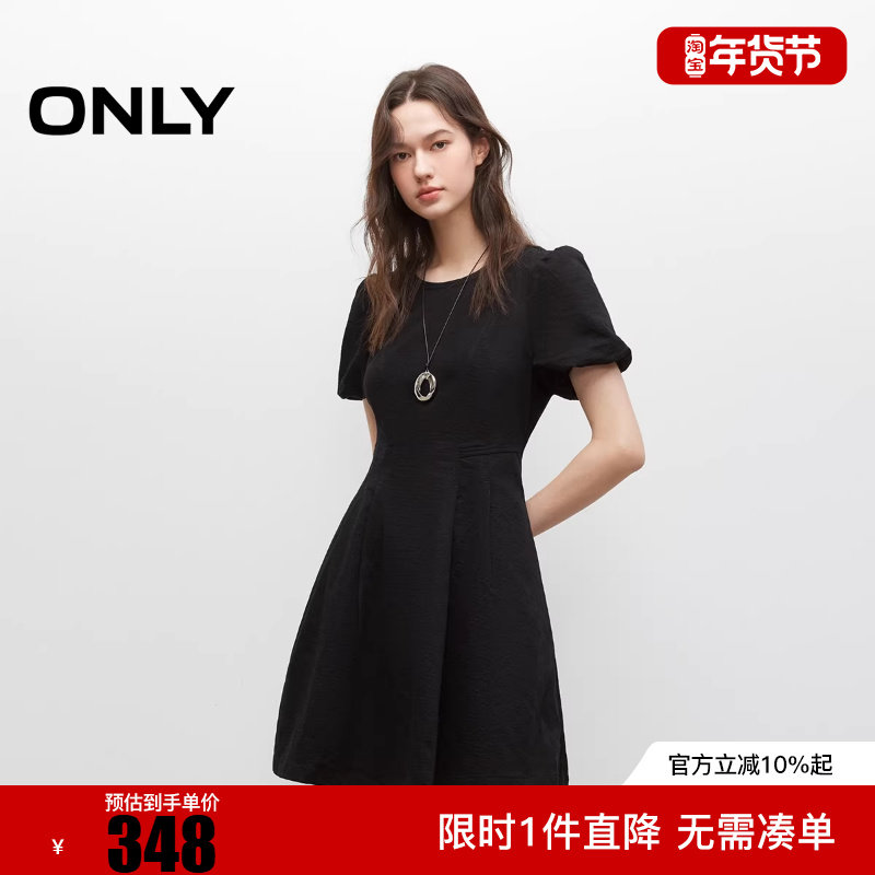 ONLY2025冬新款质感暗纹满印花苞袖收腰牛仔连衣裙女|125342013