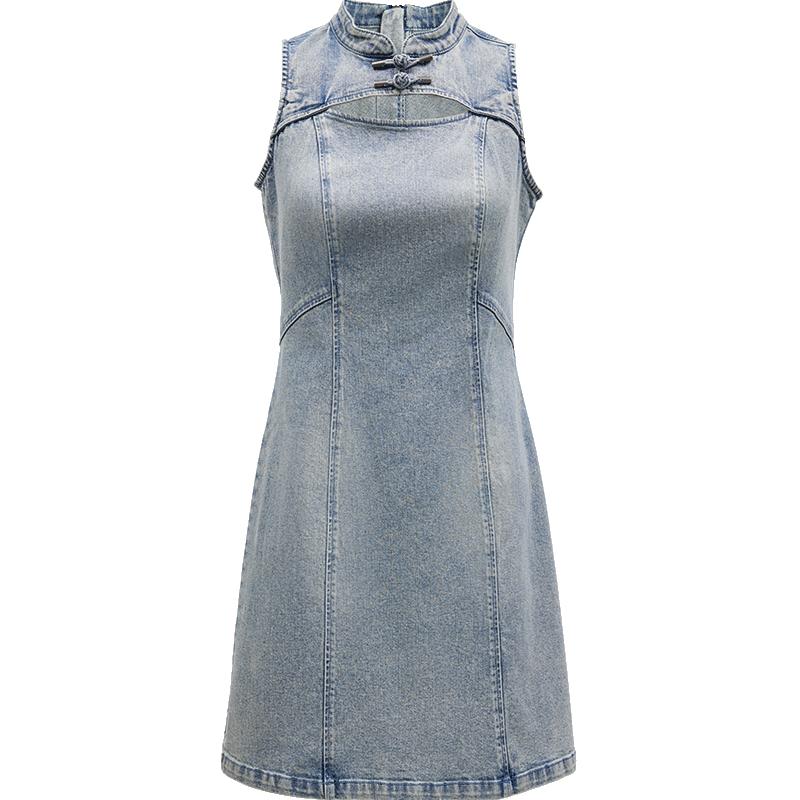 【新中式】ONLY奥莱夏季气质国风盘扣立领短裙收腰牛仔连衣裙女