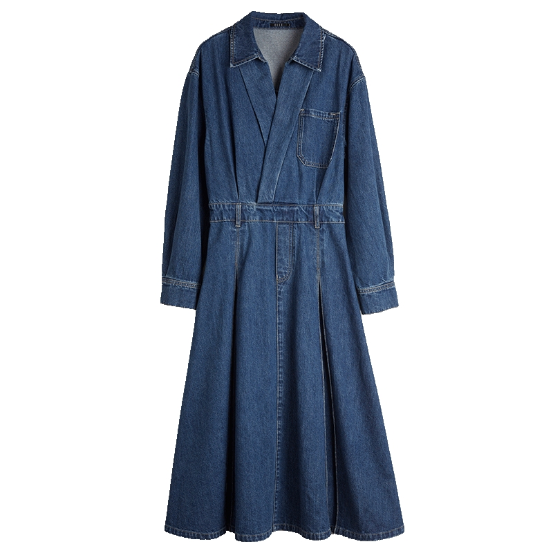 Petit Bari女士复古长袖收腰牛仔连衣裙 下摆A字型中长款牛仔裙