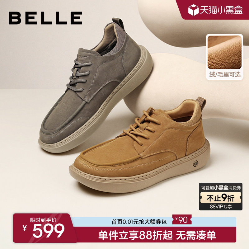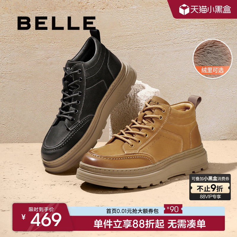 百丽男士高帮休闲工装板鞋男冬季新款牛皮厚底增高加绒棉鞋保暖靴