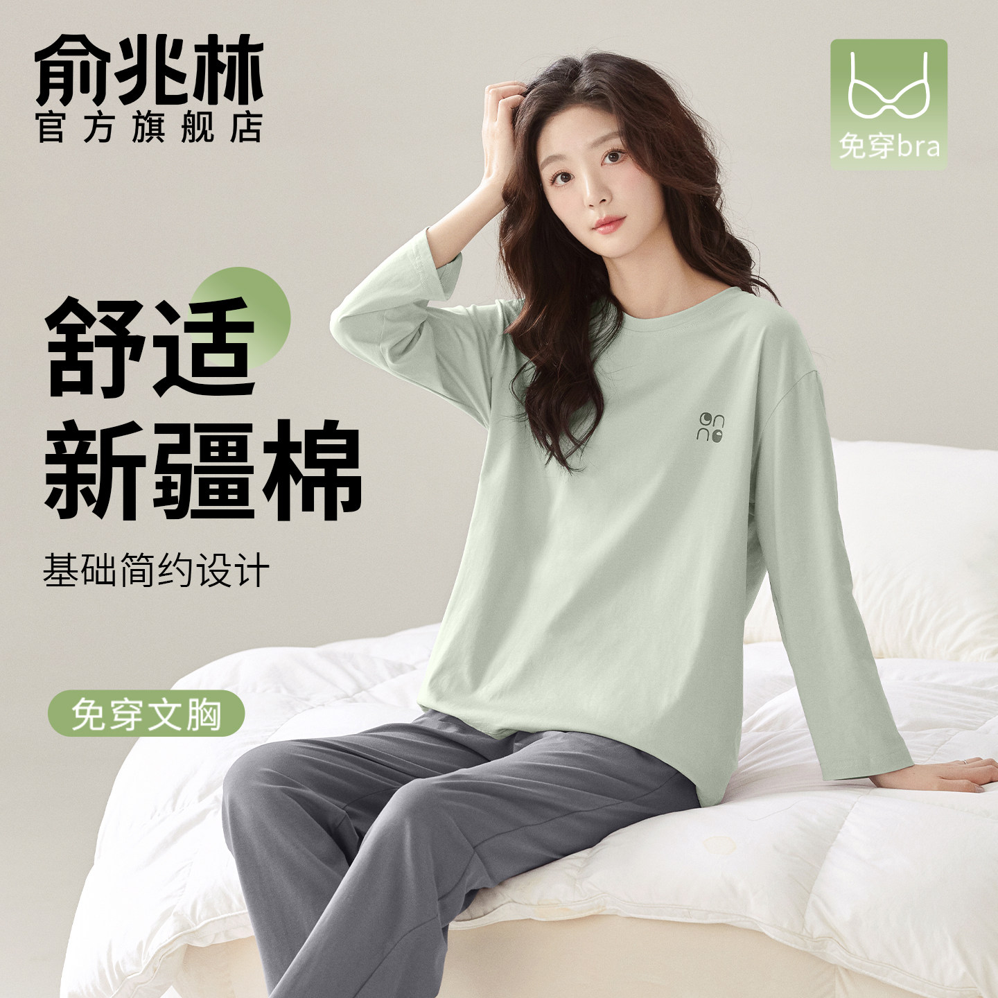 纯棉睡衣女春秋季2025新款自带胸垫宽松长袖长裤家居服套装可外穿