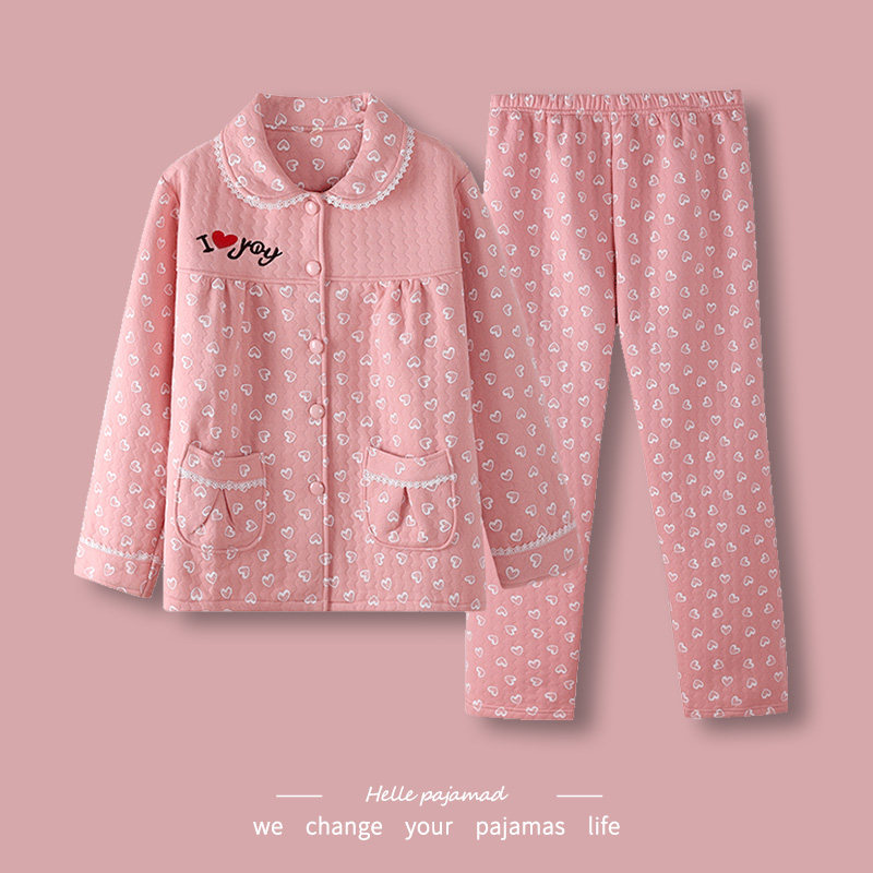 浪莎空气棉睡衣女秋冬季纯棉夹层加厚夹棉套装冬天开衫大码家居服