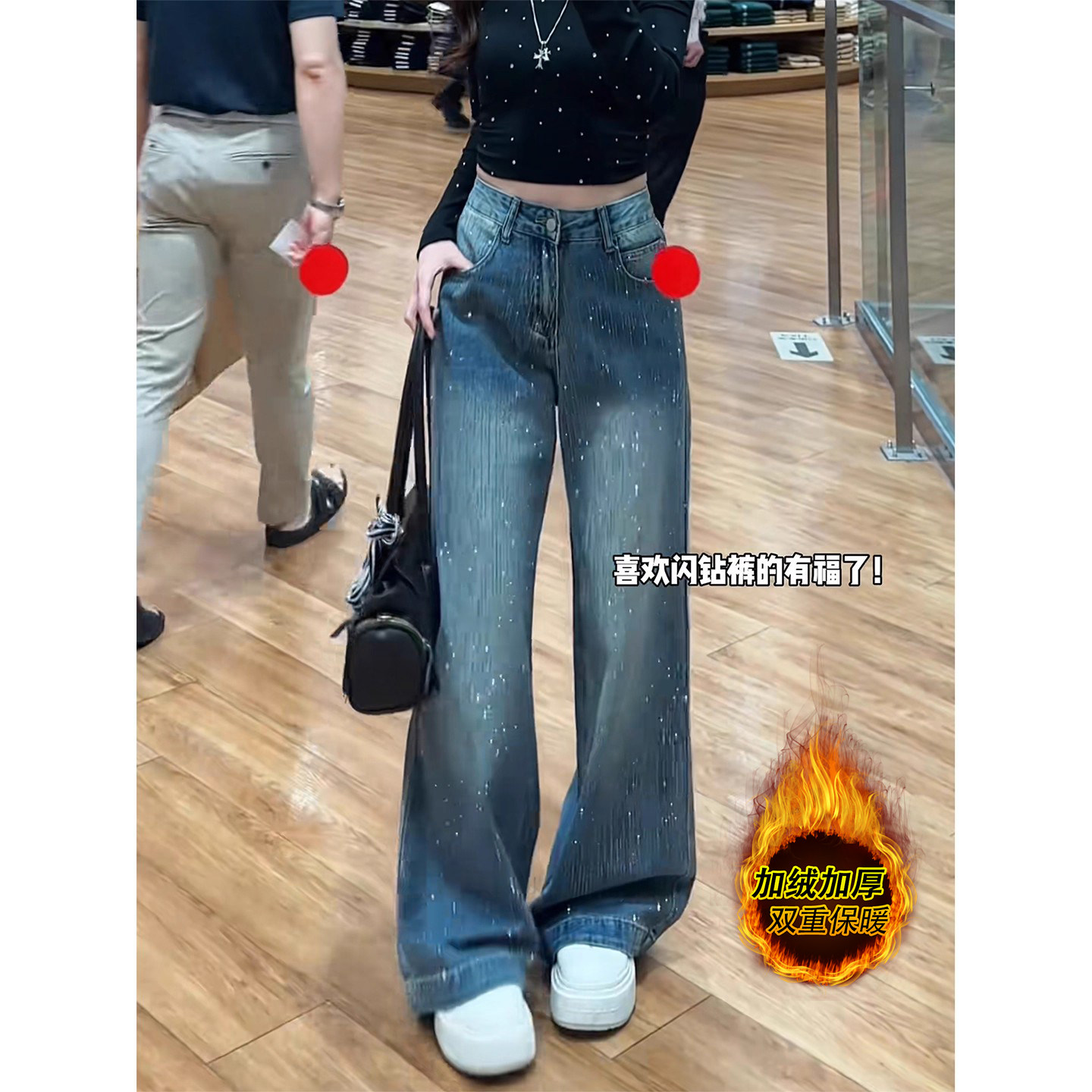高腰烫钻直筒牛仔裤女冬加绒大码胖mm梨型遮胯显瘦百搭潮流阔腿裤
