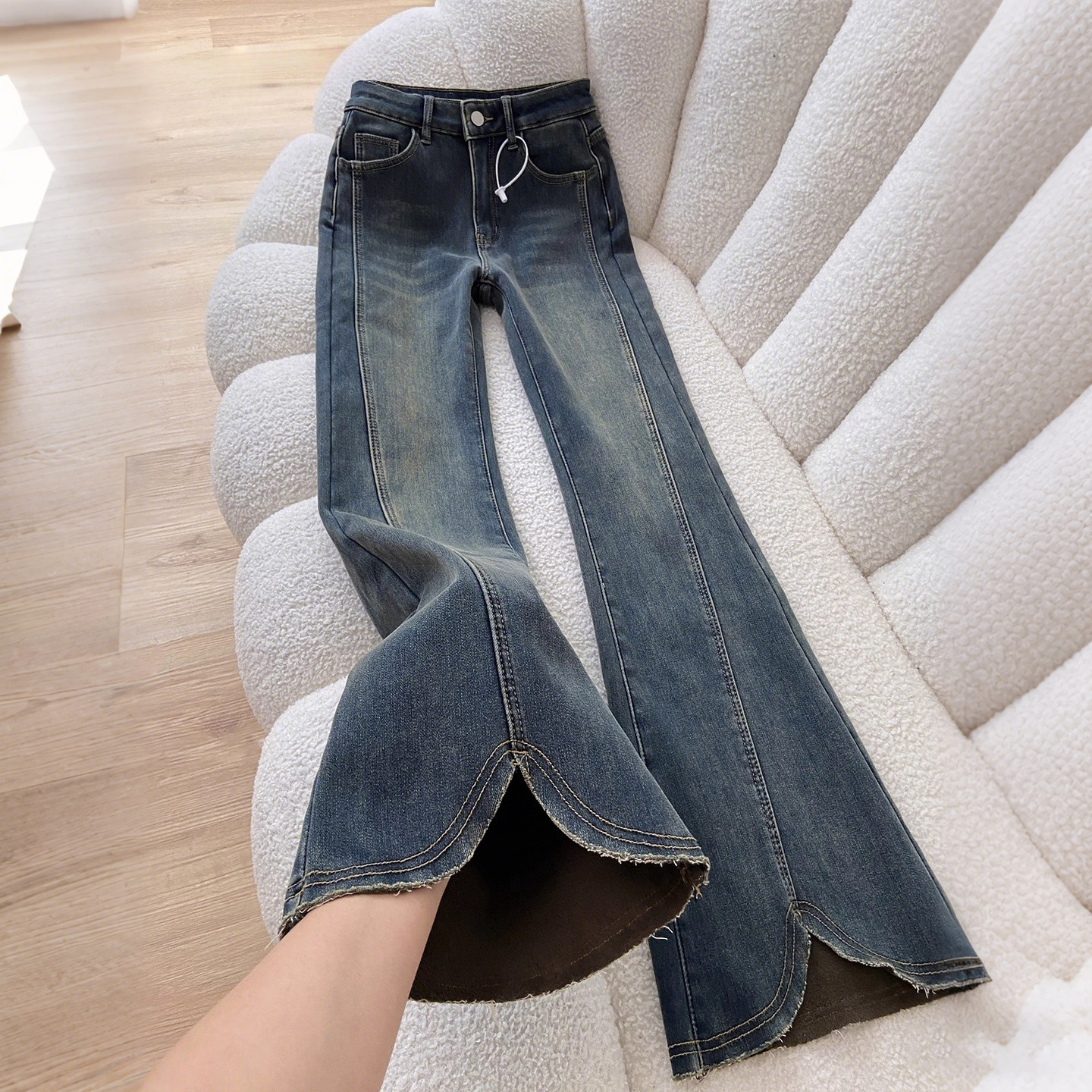 特大码女装胖mm复古设计感微喇牛仔裤女高腰显瘦开叉毛边马蹄裤潮