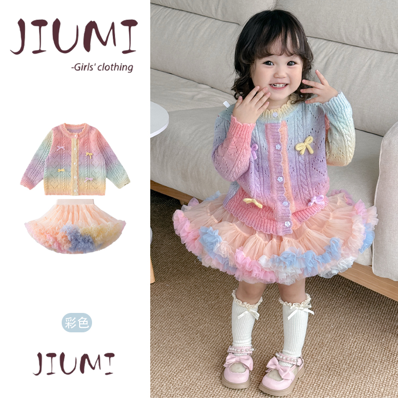 女童春秋韩版甜美针织套装宝宝渐变色毛衣开衫超蓬凸凸裙公主套装