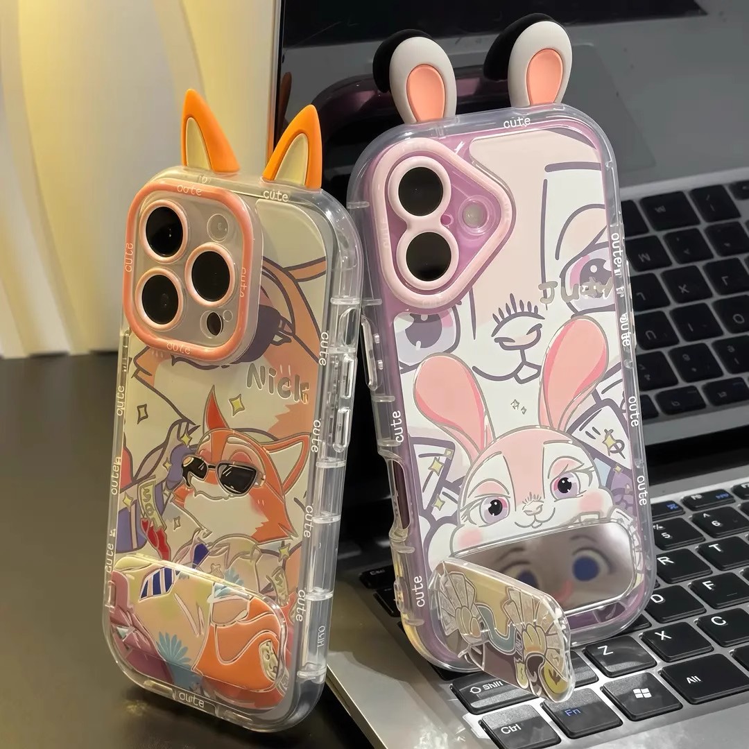 适用苹果17promax手机壳iPhone16疯狂动物城15尼克朱迪14plus镜子支架13立体耳朵12情侣11暴富8卡通7防摔壳6s