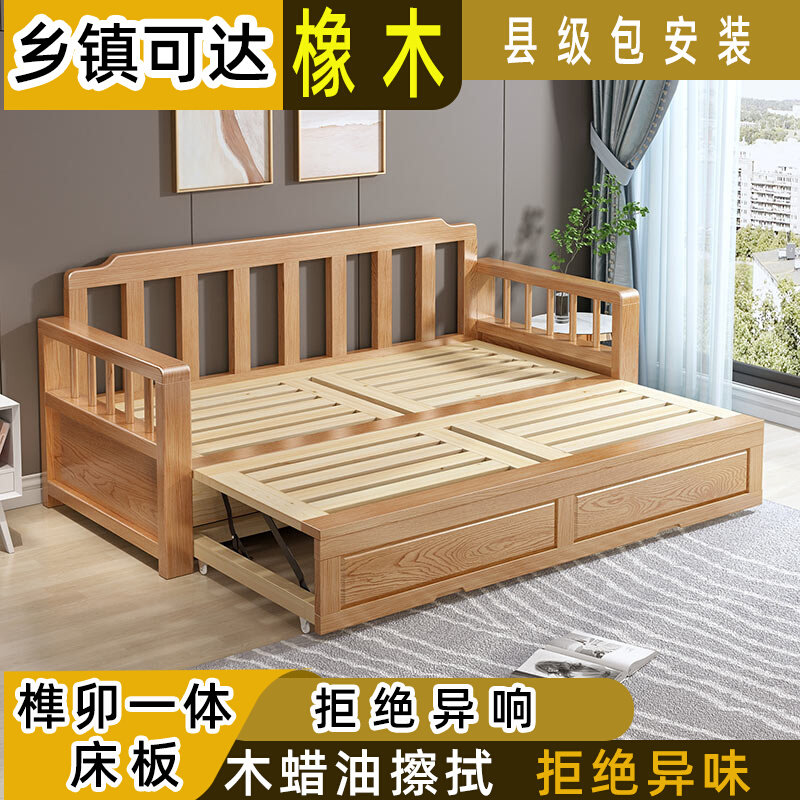 新中式家用实木沙发床客厅双人可折叠床多功能推拉木质橡木沙发床