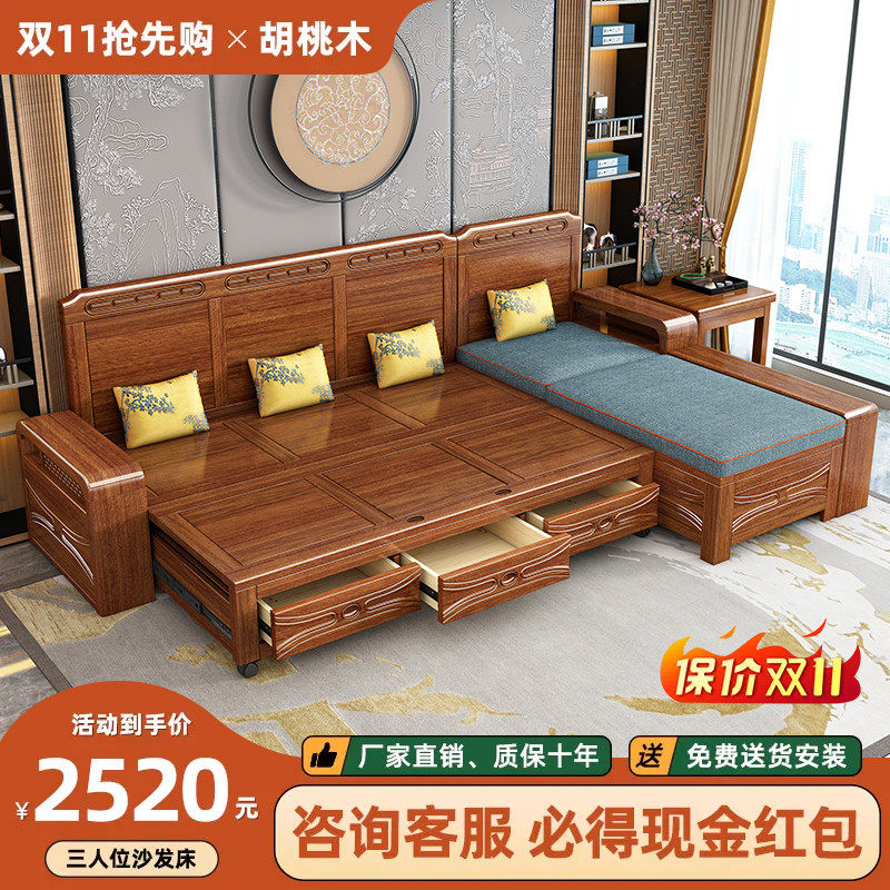 全实木沙发拉床款金丝胡桃木新中式客厅小户型沙发床木质储物家具