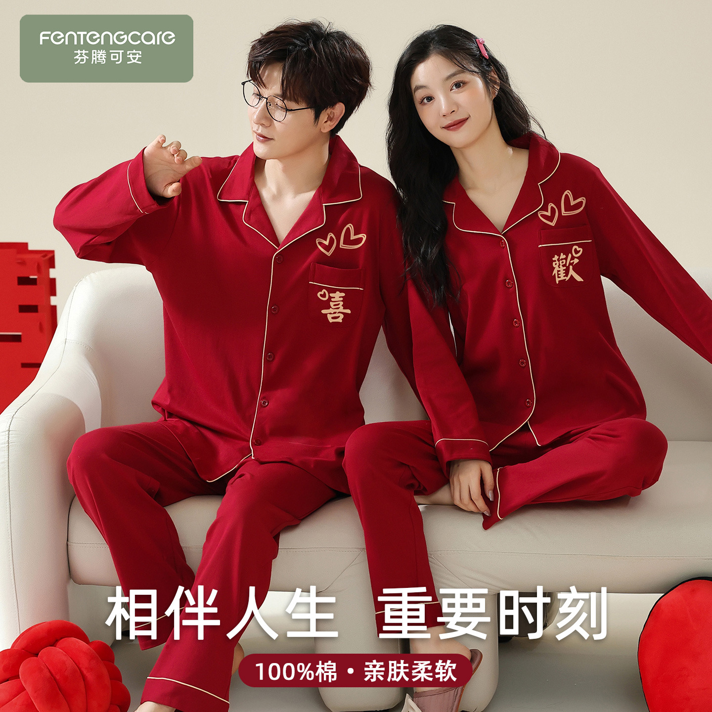 芬腾可安睡衣结婚新婚情侣套装红色秋春季纯棉大码长袖喜欢情侣装