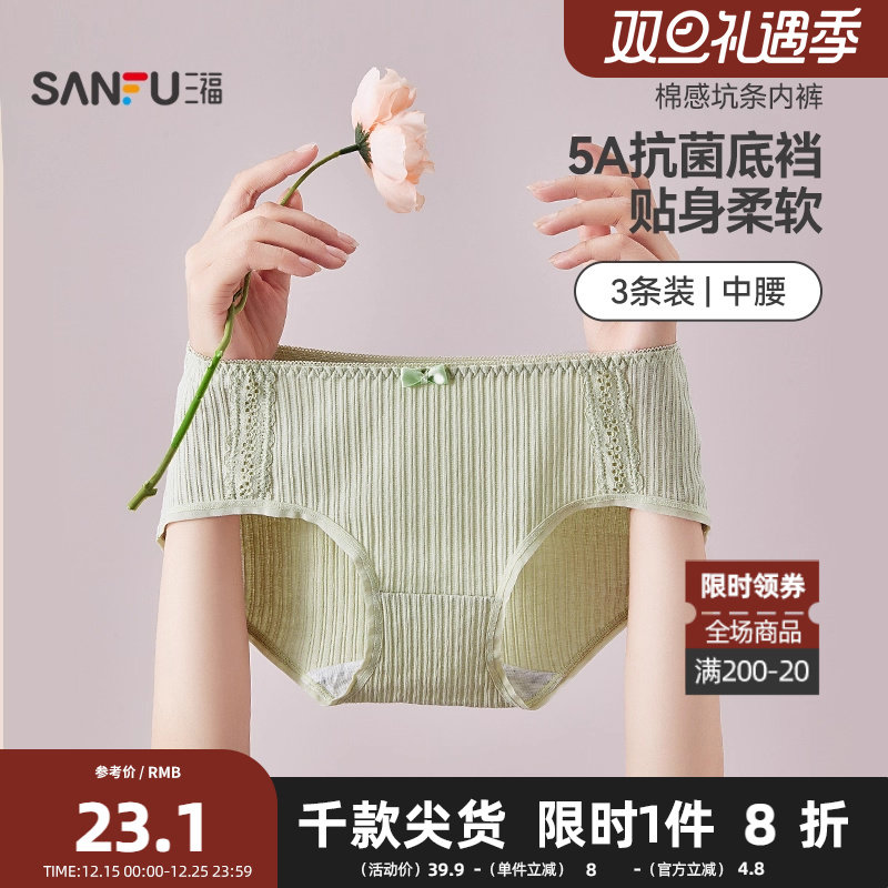 三福抗菌档内裤组合装3条装螺纹蝴蝶结蕾丝提臀弹力中腰底裤女Z