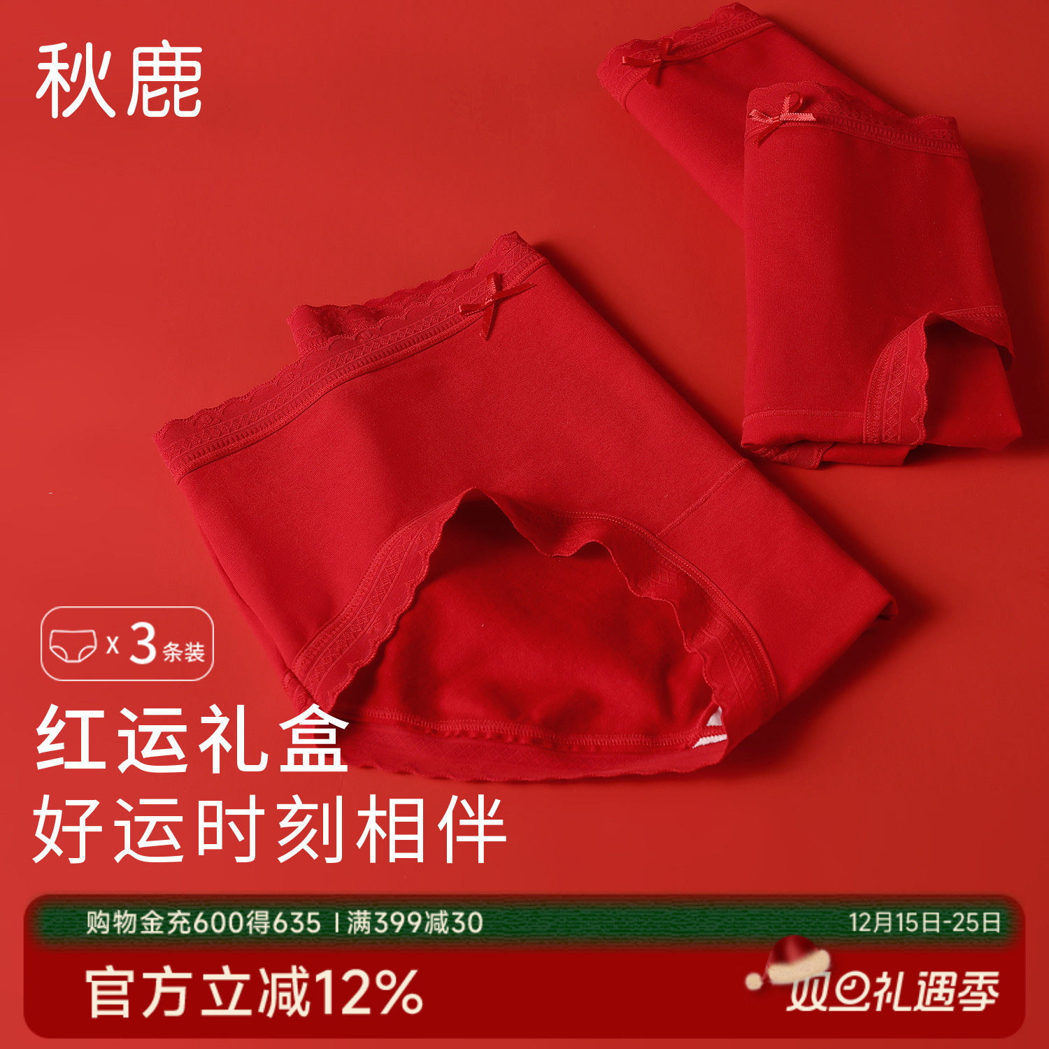 【3条装】秋鹿红色内裤女新婚结婚三角裤中腰蝴蝶结蕾丝边底裤女