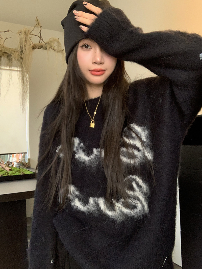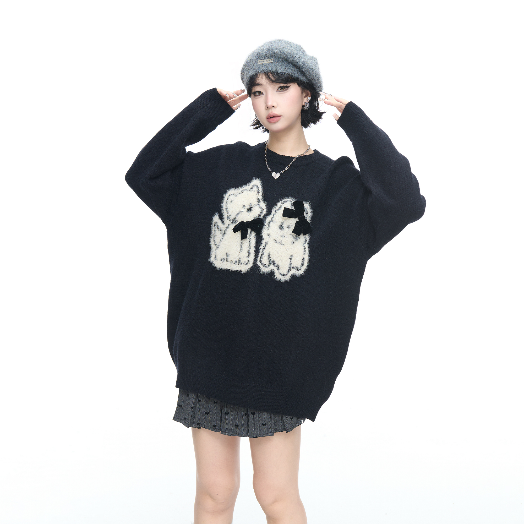 黑色圆领小狗毛衣女春秋新款宽松松弛慵懒风情侣款套头针织衫上衣