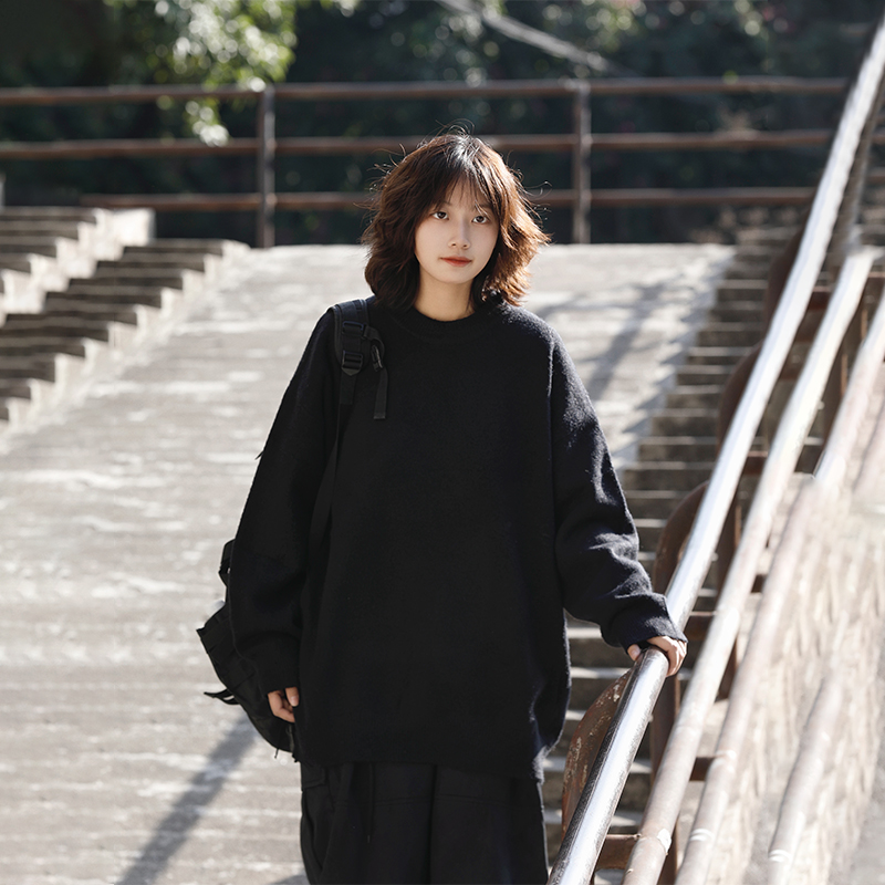 日系复古黑色套头毛衣女秋冬慵懒宽松加厚内搭打底针织衫圆领上衣