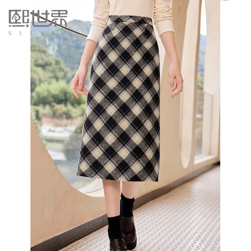 熙世界文艺复古英伦风格子半身裙女秋冬新款中长款包臀毛呢直筒裙