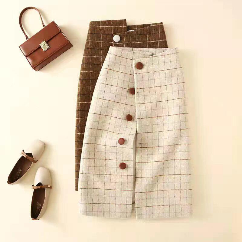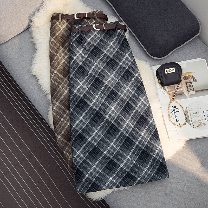毛呢格子半身裙女秋冬复古高腰显瘦气质格纹中长款a字一步包臀裙