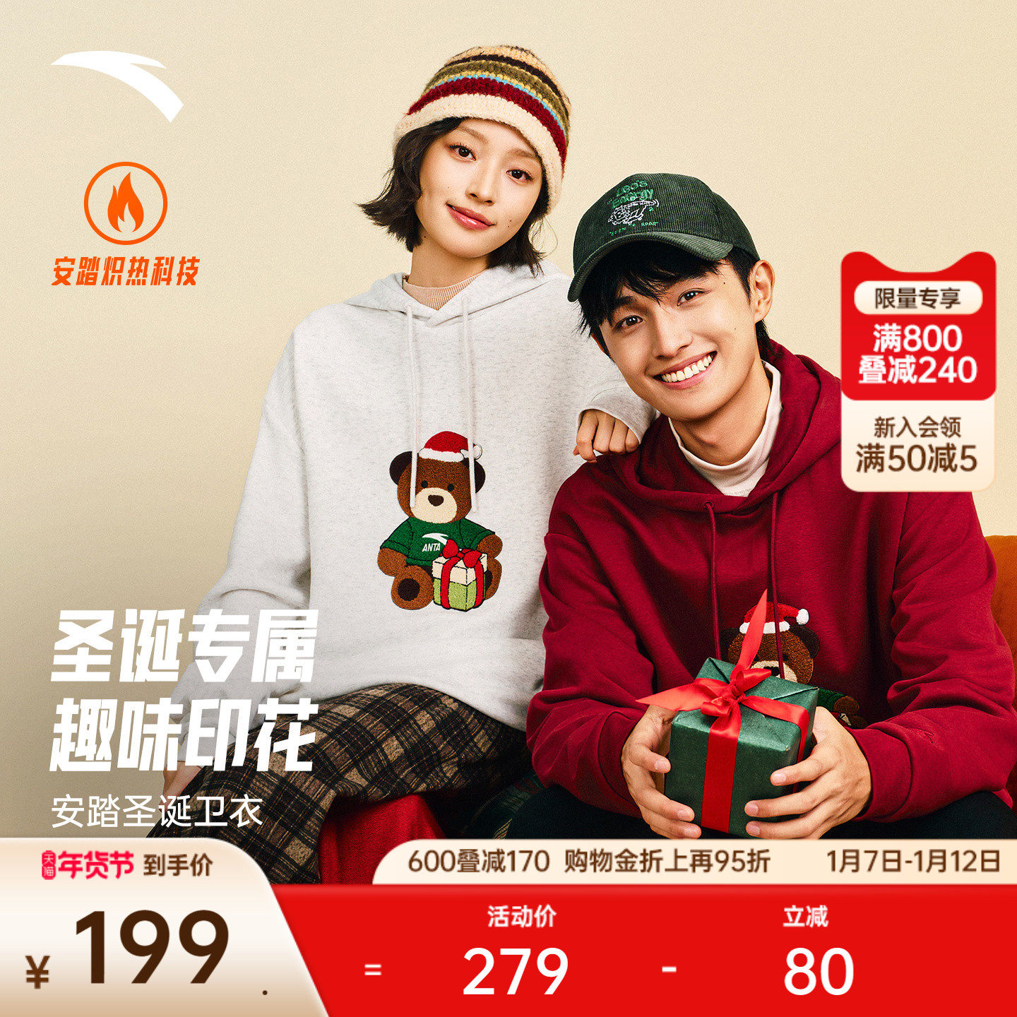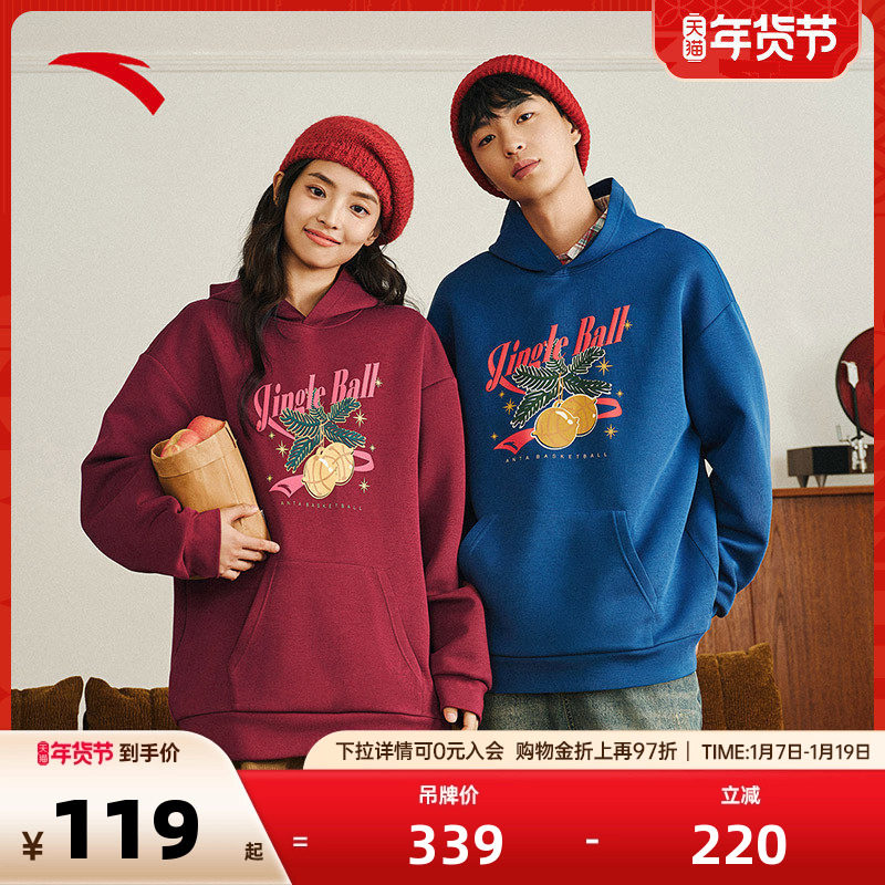 安踏圣诞加绒连帽休闲卫衣男女冬季新款宽松保暖加厚运动上衣帽衫