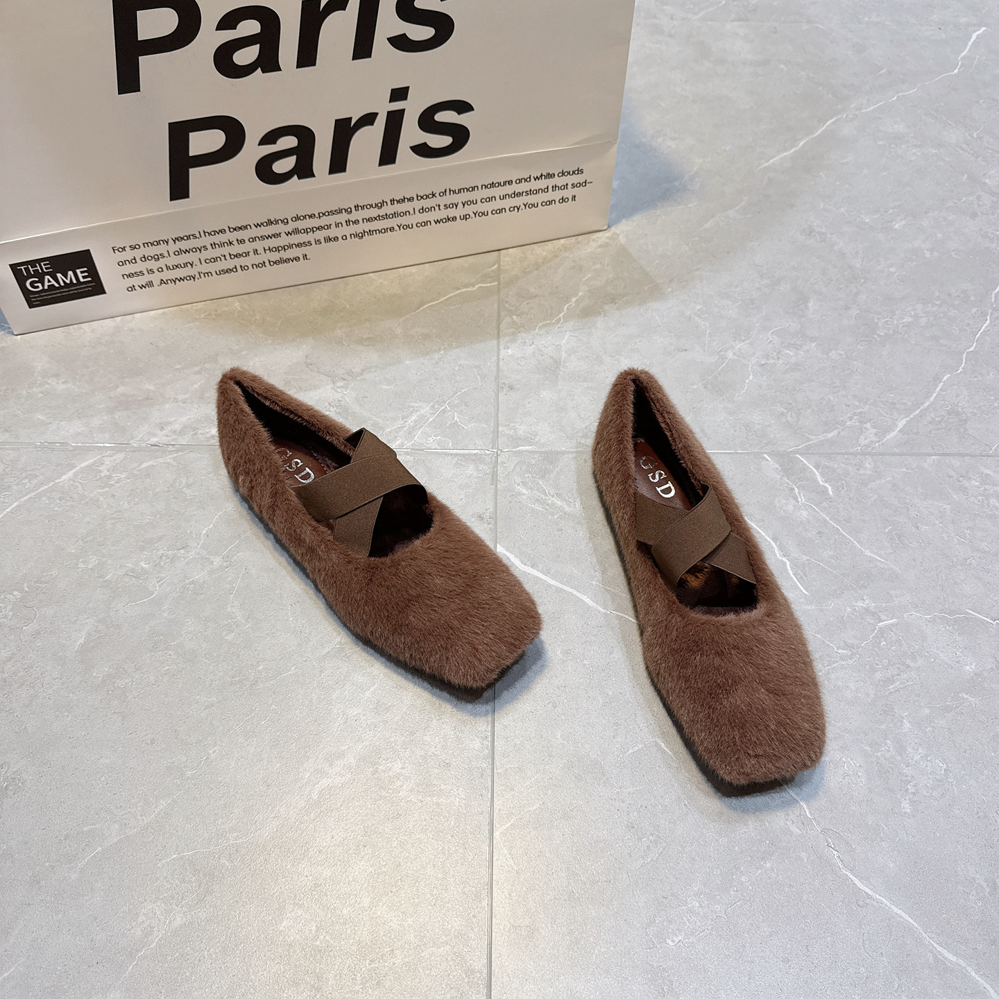 杏色浅口平底加绒芭蕾舞棉鞋女外穿2025秋冬新款法式圆头毛毛单鞋