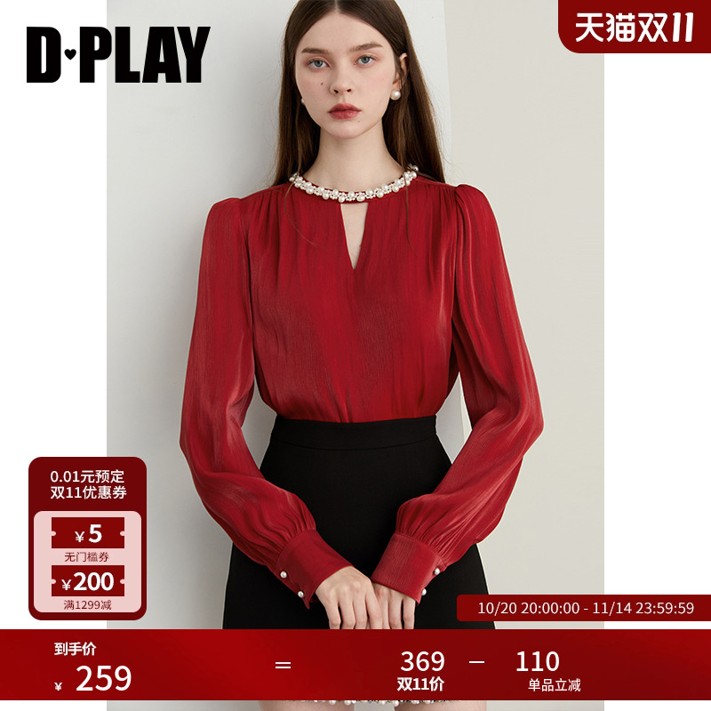 DPLAY【珠光星辰系列】2025年秋季新款红色衬衫女珍珠蝴蝶结上衣