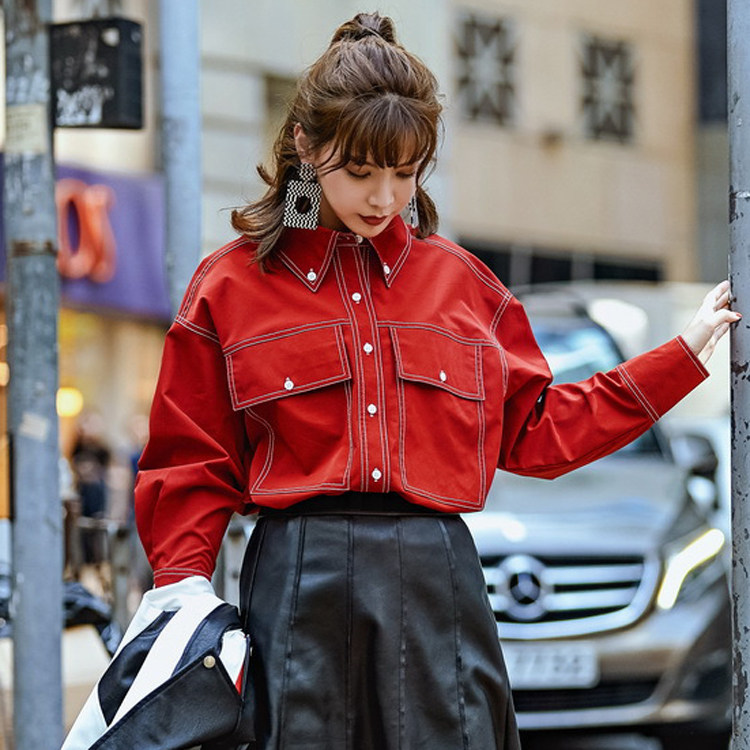 秋季新款复古红色衬衫女港味明线撞色文艺插肩袖显瘦炸街衬衣潮酷