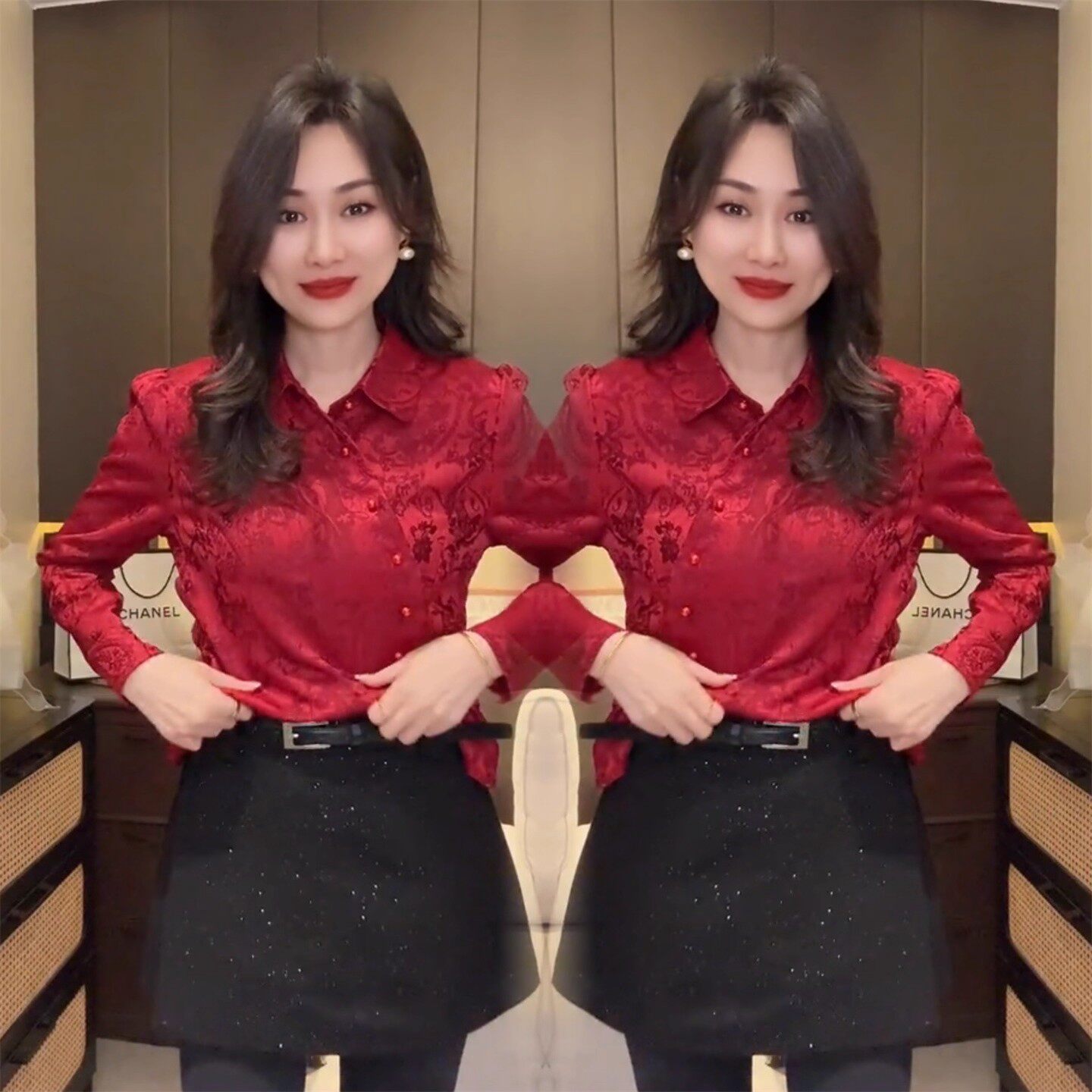 DPLAY【珠光星辰系列】红色衬衫女新款法式洋气高级宽松小衫上衣