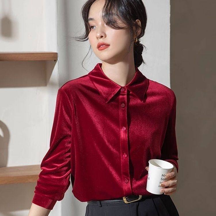 翻领法式红色丝绒衬衫女2025年秋冬新款设计感显瘦复古简约衬衣潮