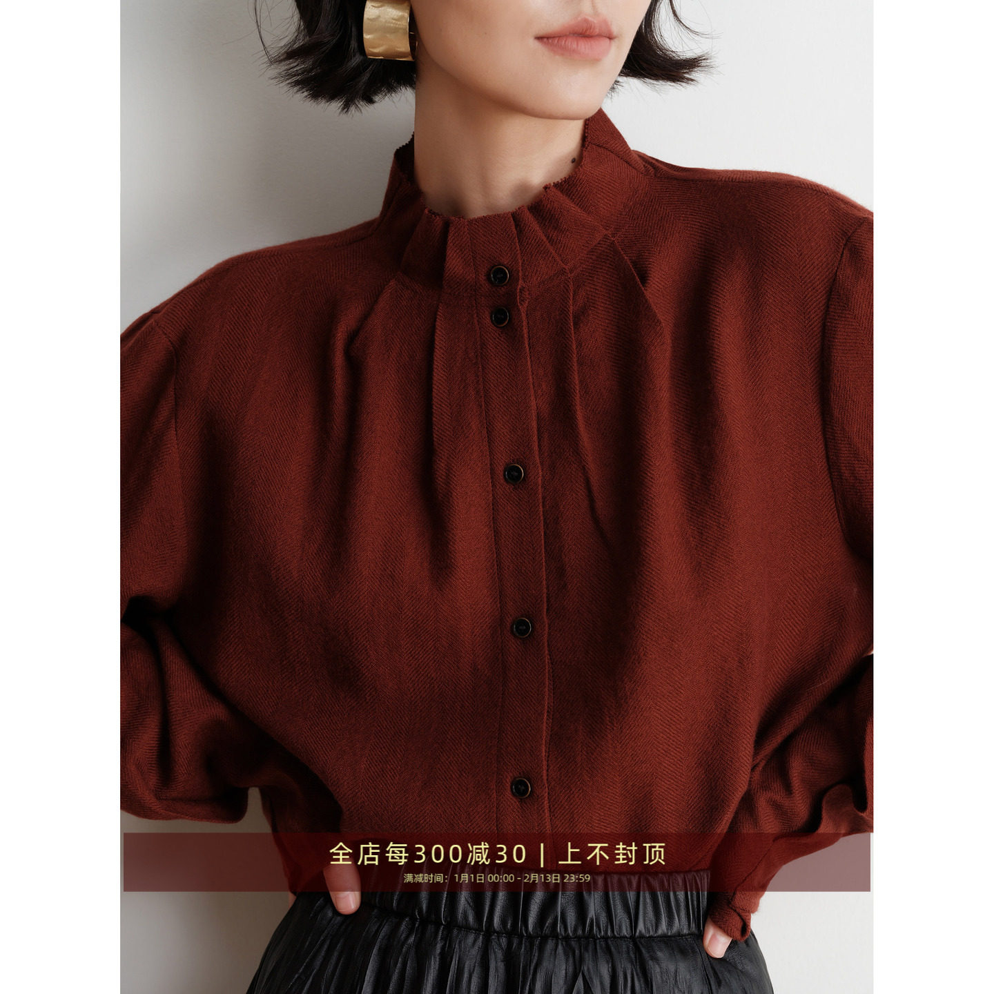 LAGOGO红色气质磨毛衬衫外套女拉谷谷秋冬新款设计感翻领叠穿上衣