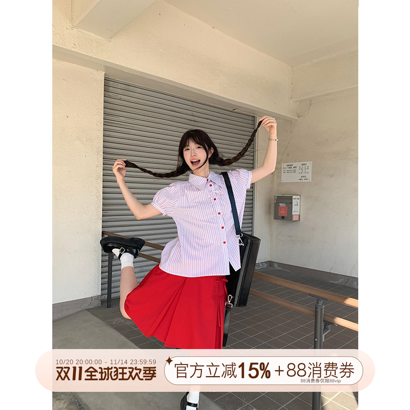 霍里德地图2025新款女衬衫夏季红色条纹蝴蝶结短袖泡泡袖衬衣上衣