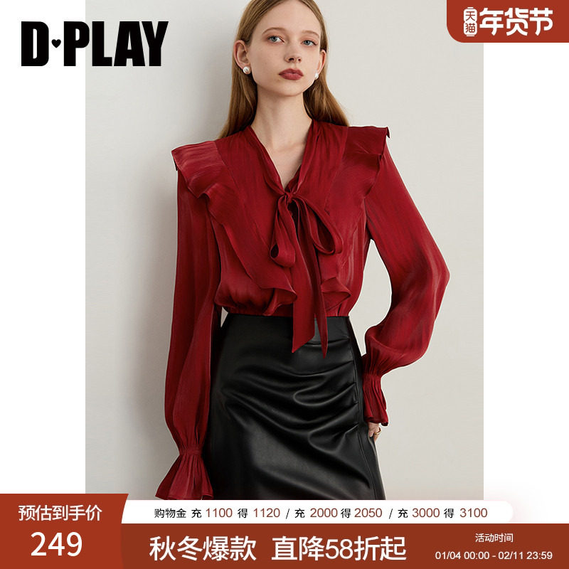 DPLAY2025年秋季新款红色衬衫女荷叶边蝴蝶结系带设计上衣衬衣