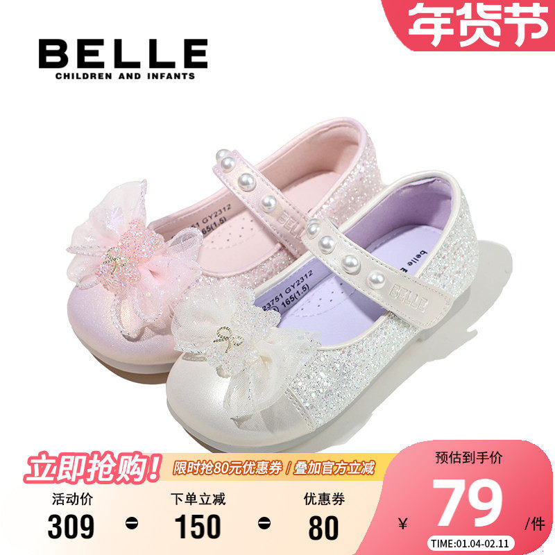 百丽童鞋小女孩软底皮鞋秋季时尚单鞋蝴蝶结公主鞋女童洋气水晶鞋