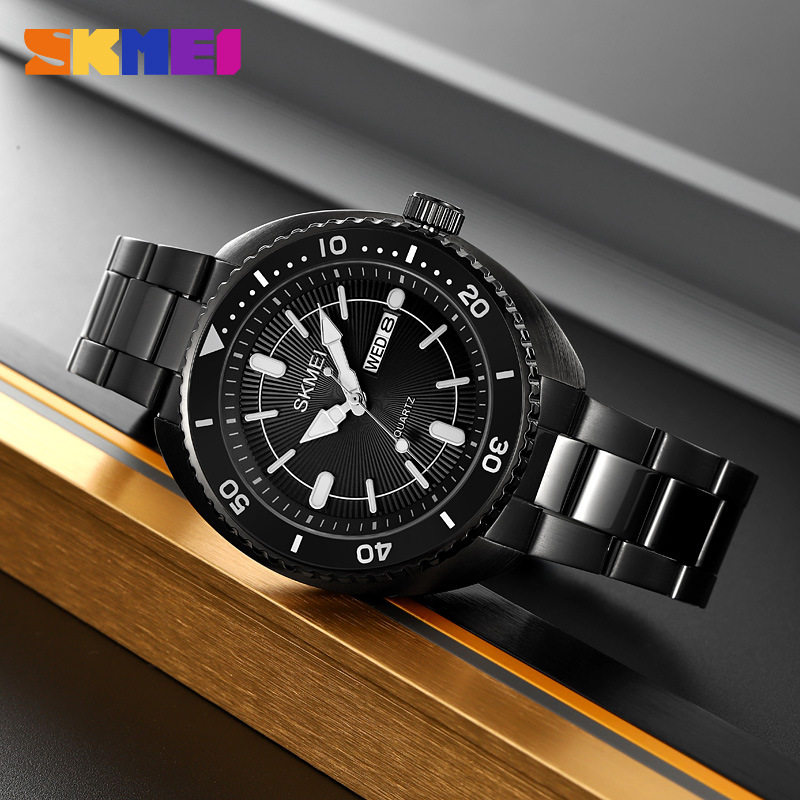 SKMEI时刻美外贸潮流休闲石英表男士大盘钢带商务日历防水手表