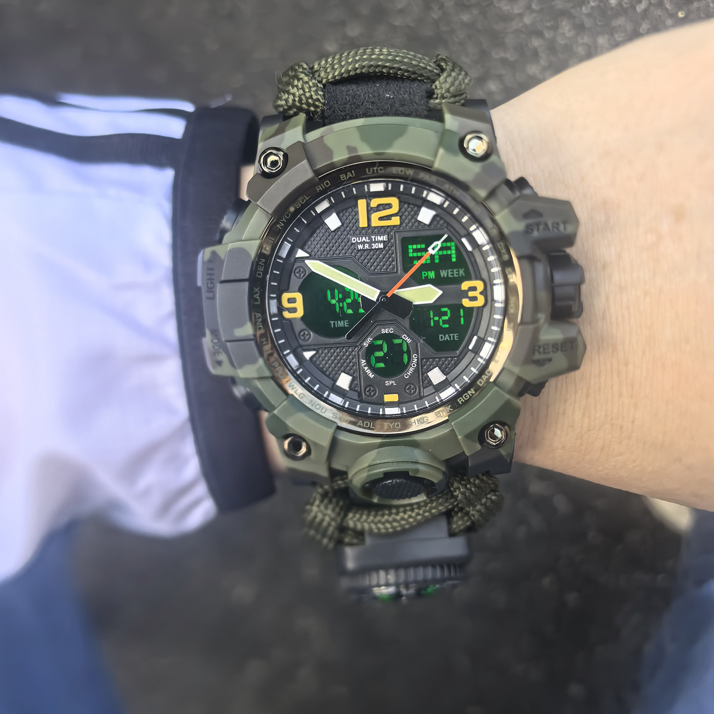 外贸军工户外运动温度计指南针手表逃生装备闹钟夜光防水大盘男表