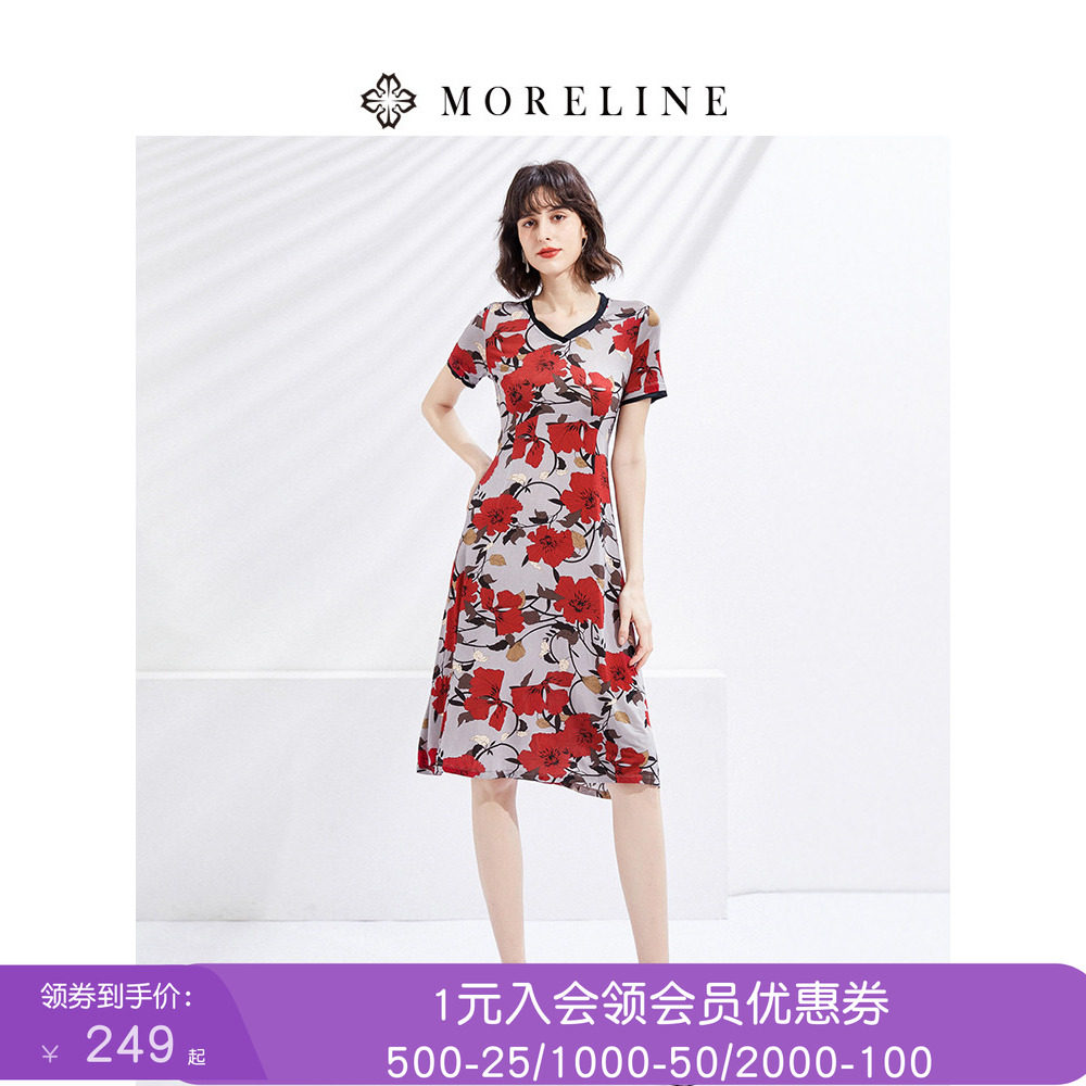 沐兰商场同款气质修身印花连衣裙夏新款小V领短袖修身中长裙女装