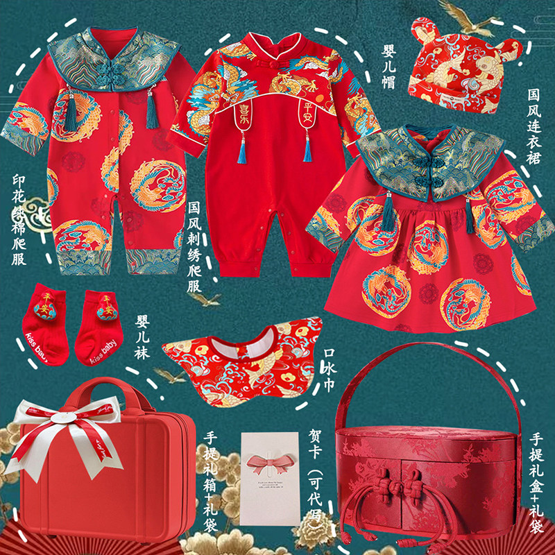 新生婴儿衣服春秋装礼盒套装红色新中式国风满月服百天周岁见面礼