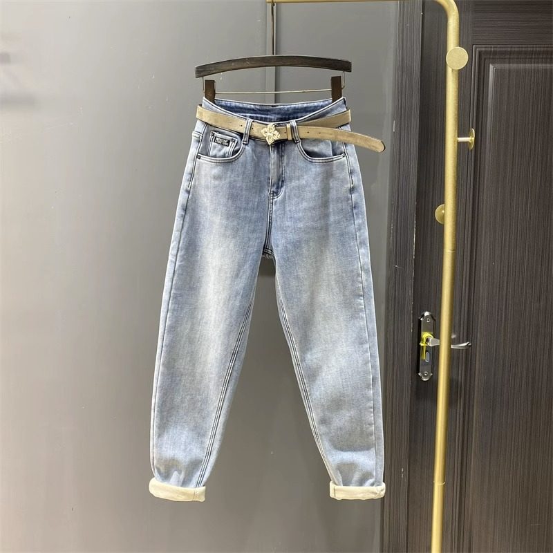 欧货2025秋冬新款浅蓝色牛仔裤女加绒加厚高腰宽松小脚萝卜哈伦裤